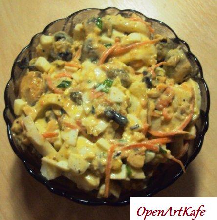 200 грам консервированных кальмар в масле, 300 грам консервированных мидий, 150 грам морковки по-корейски, 4 яичка, зеленоватый лук и 150 грам майонеза.