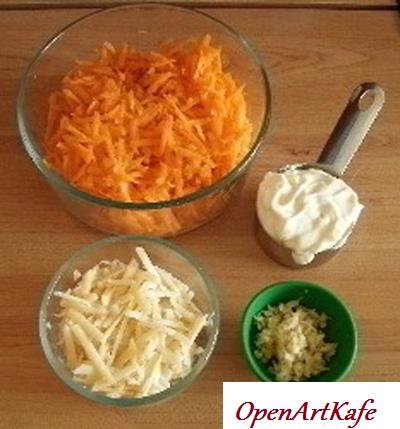3 моркови, плавленый сырок, 100мл майонеза, 2-3 зубка чеснока, зелень.