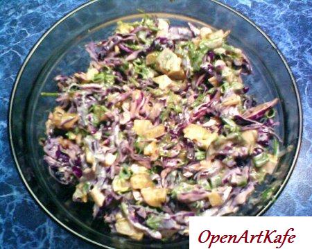 Салат из голубой капусты аппетитный, малокалорийный салат. Хорошее прибавленье к гарниру. Пригодится:Половинка голубой капусты (маленькой), 2 шт. соленого огурца, по маленькому пучку укропа, петрушки, зеленоватого лука, 1 столовая ложка горчицы, сто грам растительного масла, 2 столовые ложки малокалорийного майонеза, 1 столовая ложка кетчупа, соль и перец.