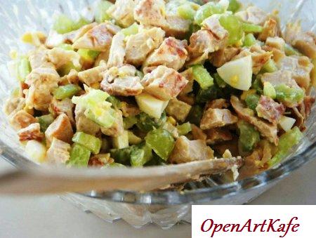 четыресто грам винограда кишмиш, четыресто грам шампиньонов, пол кг куриного филе, 4 яичка, 1 луковица, майонез, уксус, растительное масло, соль, сахар и специи.