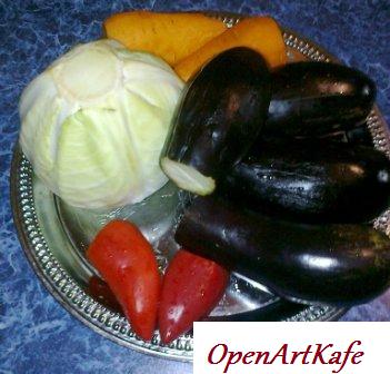 одна головка капусты, 1 кг баклажан, 2 средние морковки, 2 салатных перца, соль.