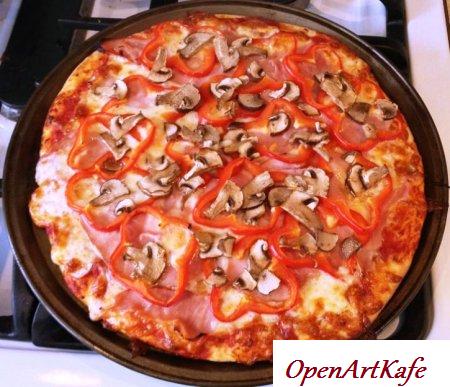 9. Перец порезать кольцами, выложить сверху пирога, украсить грибами.