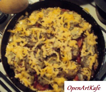 2 незначительных баклажан, 1 луковица, 3 шт. помидора, перец, 1 плавленый сырок, соль, растительное масло для жгучи.